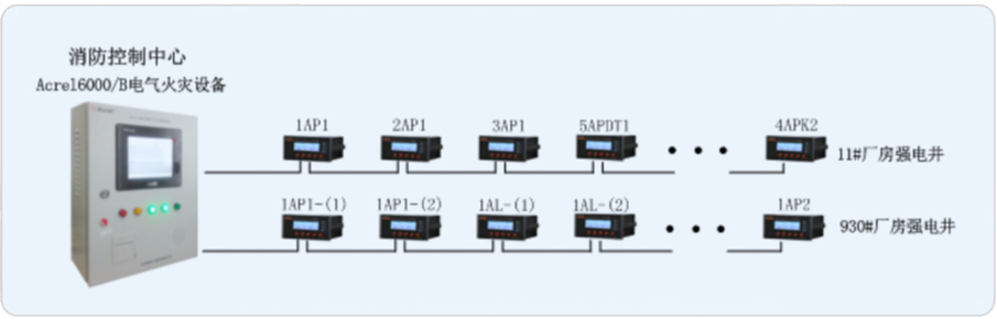 我司承接其電氣火災系統(tǒng)的搭建,對安裝于廠房配電箱進線處的剩余電流火災探測器設計一套Acrel-6000/B電氣火災系統(tǒng),由此來實時監(jiān)測廠房內(nèi)重要回路的漏電流,以確保廠房配電系統(tǒng)的電氣安全。