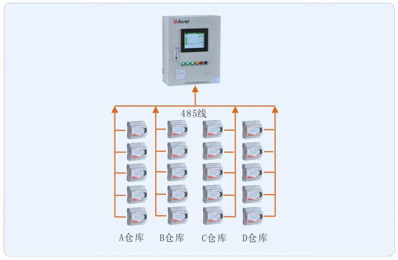 系統采用安科瑞消防電源監控系統,該系統主要采用分層分布式網絡結構,系統結構為:站控管理層、網絡通訊層和現場設備層。其中廣陳第三方電子商務平臺托管產業基地現場設備分布為A、B、C、D倉庫以及綜合辦公用房消防配電回路。該系統監控所有消防配電柜內消防回路雙電源的實時運行狀態,如有異常會后臺報警。所有監測模塊通過485總線鋪設至消防控制室,消防電源監控主機從而完成對監測模塊的采集并監控。
