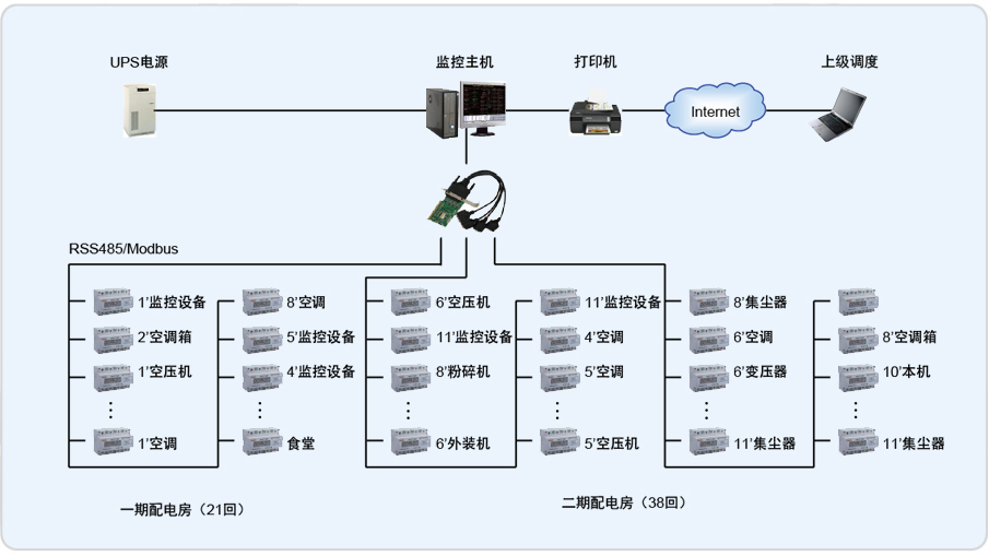 整個系統(tǒng)采用分布式結(jié)構(gòu),監(jiān)控主機(jī)位于東區(qū)主辦公室內(nèi),一期配電房和二期配電房采用RS485總線直接接入監(jiān)控主機(jī)擴(kuò)展卡的串口。對于每個回路采用ADL 300-EF/C三相電能表,共59個回路;站控層應(yīng)用國內(nèi)知名的聯(lián)想商用計算機(jī)作為監(jiān)控主機(jī),同時設(shè)有用于報表打印輸出的打印機(jī);防止異常斷電而引發(fā)的數(shù)據(jù)丟失的UPS設(shè)備。監(jiān)控軟件平臺采用單機(jī)版Acrel-2000型電力監(jiān)控系統(tǒng)。Acrel-2000型電力監(jiān)控系統(tǒng)預(yù)留了擴(kuò)展接口,可方便進(jìn)行擴(kuò)展。