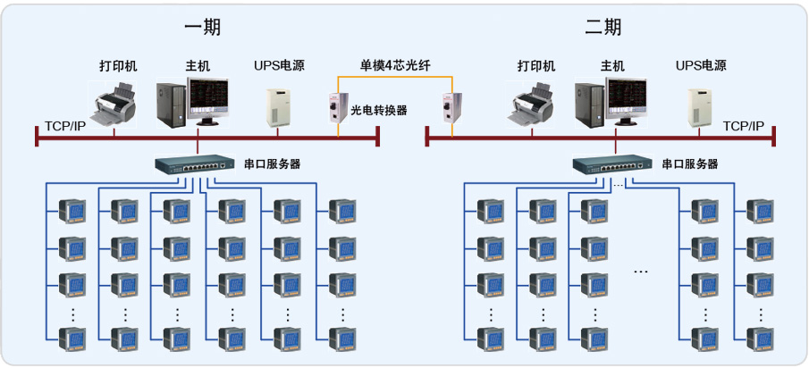 一期配電房由兩個相互獨立的配電房組成,動力中心配電房包含主室和次室,次室距主室的約30米。其中Acrel-2000電力監(jiān)控系統(tǒng)在動力中心配電室的次室里。動力中心配電房有2臺變壓器(1#變壓器、2#變壓器),共有57臺ACR120EL;現場采用4根屏蔽雙絞總線連接。生產車間配電房中有2臺變壓器(3#變壓器、4#變壓器),共有39臺智能儀表,現場采用2根RS485總線上傳至主機。