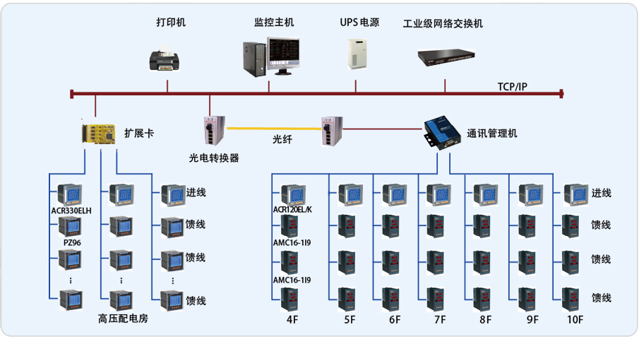 整個(gè)系統(tǒng)采用分布式結(jié)構(gòu),在上海東方電視臺(tái)變電所監(jiān)控室放置監(jiān)控主機(jī)及通訊采集裝置,現(xiàn)場各回路的儀表采用屏蔽雙絞線以總線型方式連接至通訊采集裝置,通訊管理機(jī)連接至交換機(jī),其中劇場中設(shè)備用光纖連接至監(jiān)控室。
