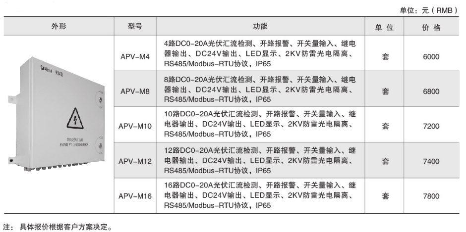 APV系列智能光伏匯流箱主要作用就是對光伏電池陣列的輸入進行一級匯流,用于減少光電池陣列接入到逆變器的連線,優化系統結構,提高可靠性和可維護性。...